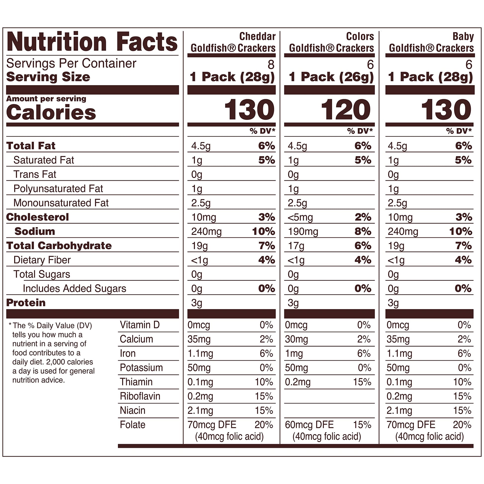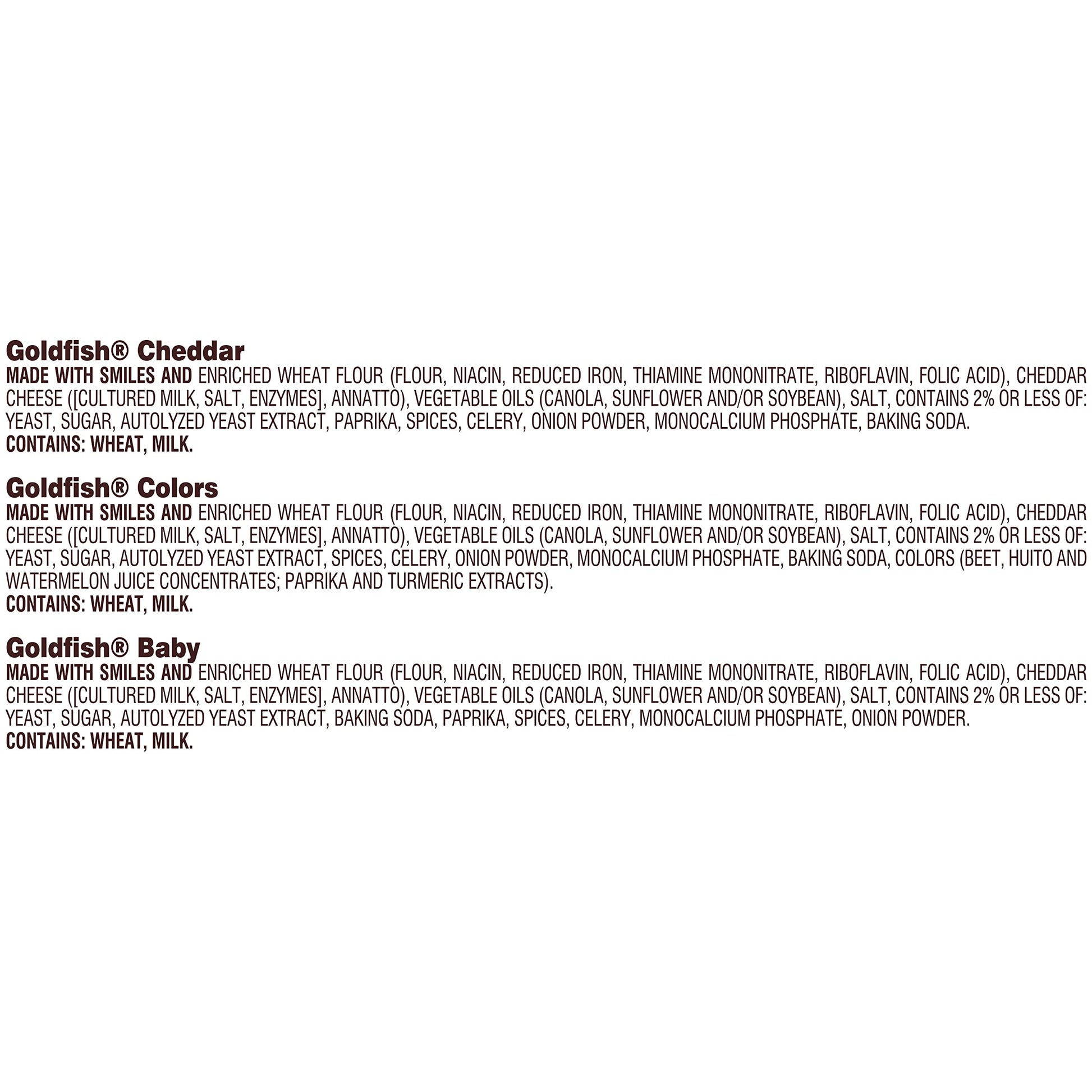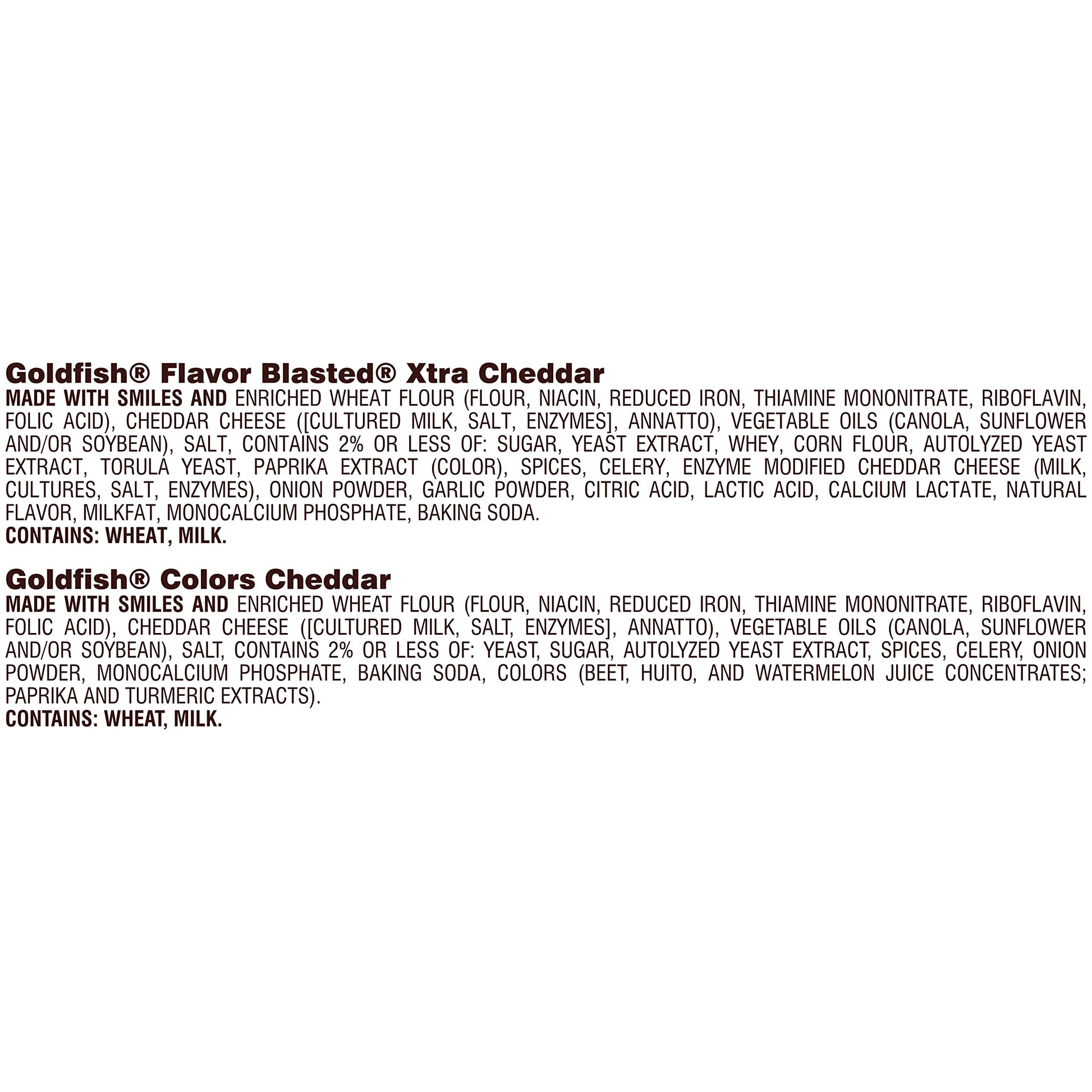 - Variety pack includes: 10 single-serving packs of Goldfish colors, 12 packs of Goldfish cheddar, 8 packs of Goldfish pretzels