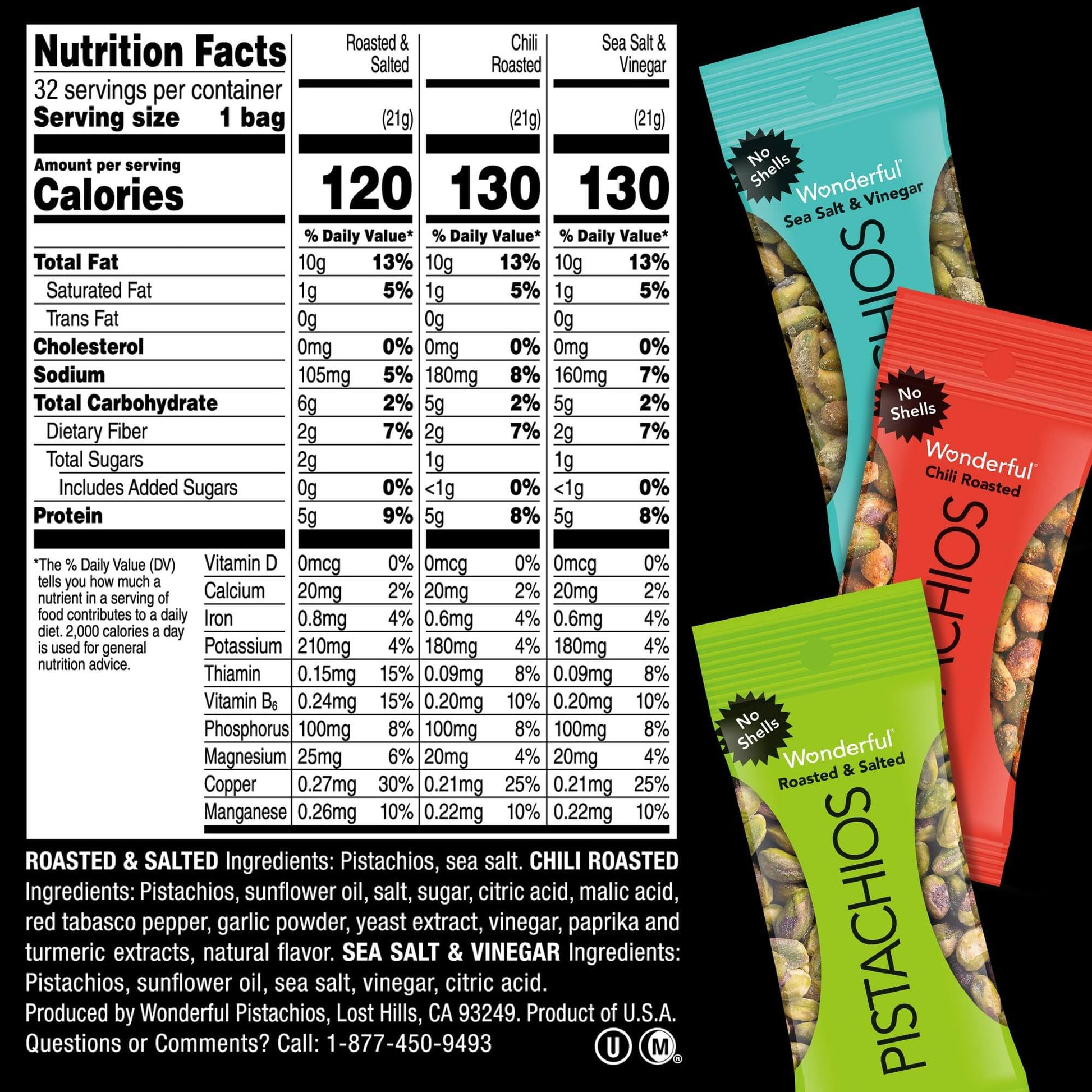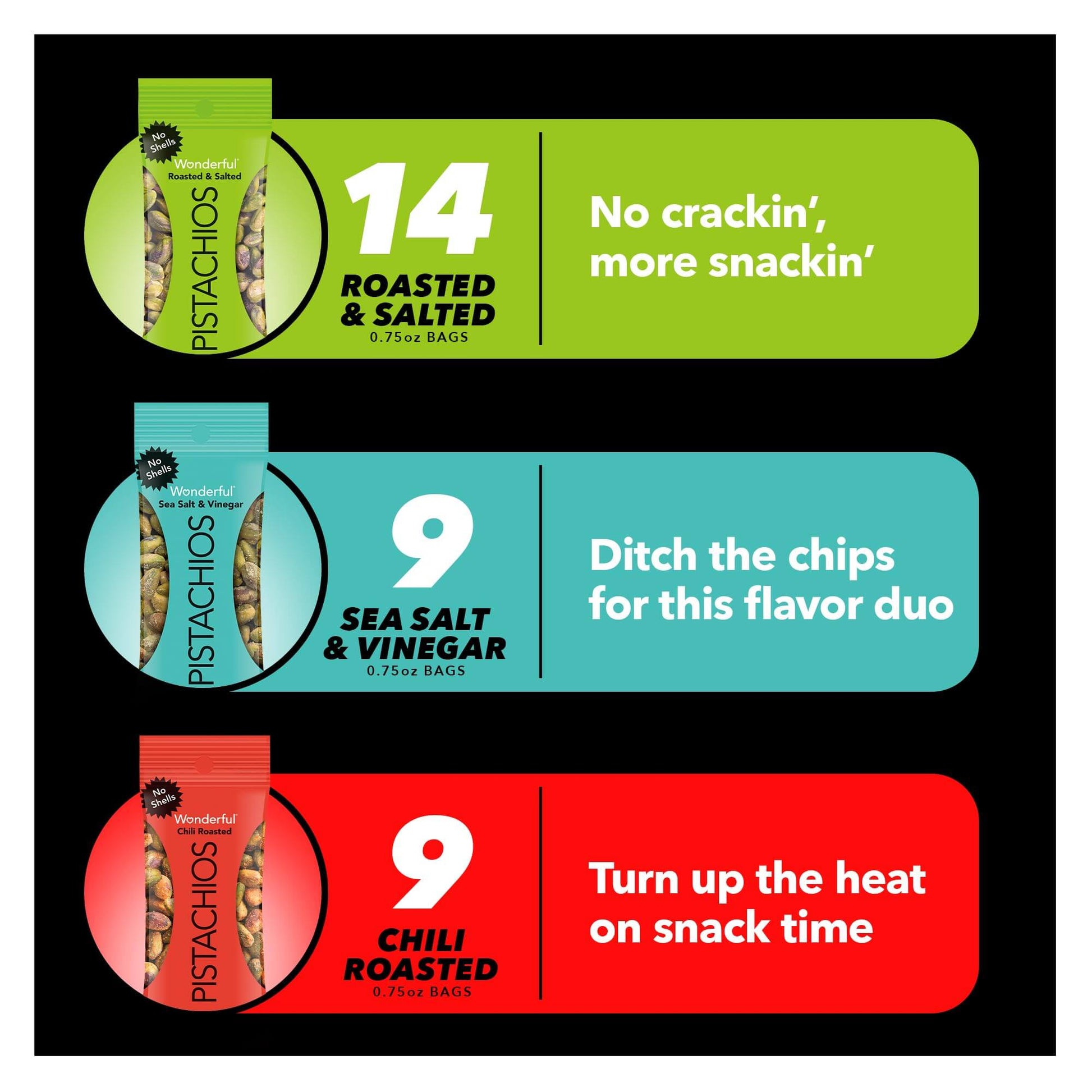 Enjoy the perfect snacking experience with our Wonderful Pistachios No Shells variety pack. Each box contains 9 individual 0.75-ounce bags featuring three delicious flavors that satisfy every craving.